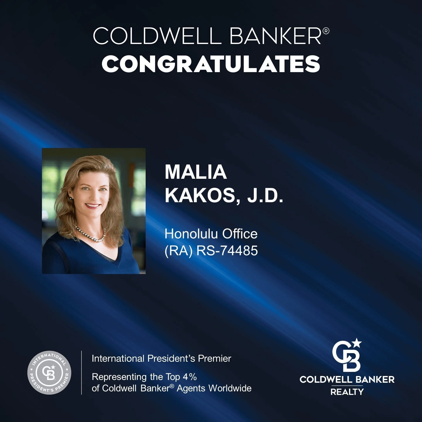 Malia is proud to be a Specialist in the prestigious Coldwell Banker Global Luxury program, the market leader in luxury home sales both locally and nationally. Luxury Property Specialists must demonstrate the highest level of market knowledge and professionalism in the luxury market arena. This standard of excellence is why Coldwell Banker Global Luxury dominates the market. Malia earned this designation within six months of being with Coldwell Banker and is consistently in the top 1% to 4% of all Coldwell Banker agents worldwide. Other recognitions include America’s Best representing the top 1.5% of more than 1.6 million licensed Realtors®️ nationwide, The A-List recognition from AREAA, and Best in Real Estate by Honolulu Magazine, and Hawaii Business Magazine top producing Duo for Coldwell Banker Realty.