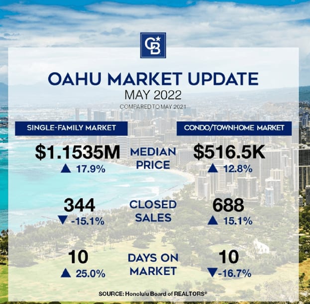 Condos in the more affordable price range of $300,000 to %599,999 represented 48.0% of closed sales in May, with a volume increase of 13.4% from one year ago. Condo sales in the $700,00 to $899,999 range more than doubled compared to May 2021, representing 17.6% of May closing. The Metro region accounted for the most significant increase in confo sales, up 21.9% while the Ewa Plain area saw sales decline by: 20.3%